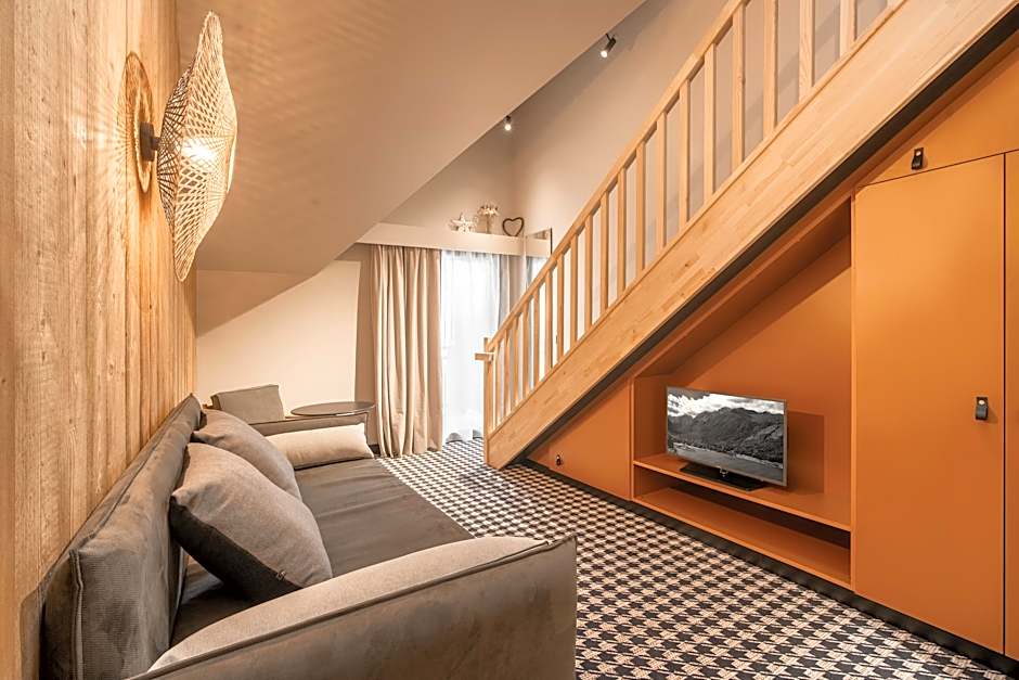 Room with a mezzanine in mountain style equipped with a bed 160 by 200 and a convertible sofa bed two places (2 single beds), bathroom with separate WC, mini-bar, safe-deposit box, with or without balcony